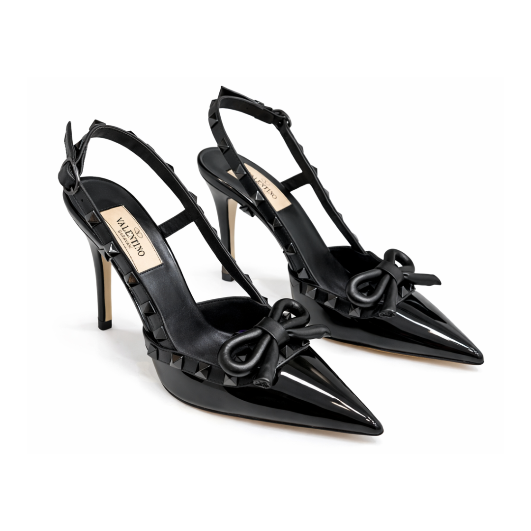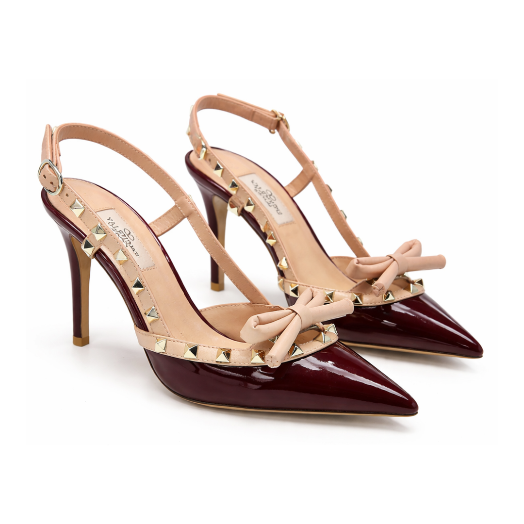 The Astor Stud is a refined slingback stiletto crafted in high-gloss leather with signature stud detailing.