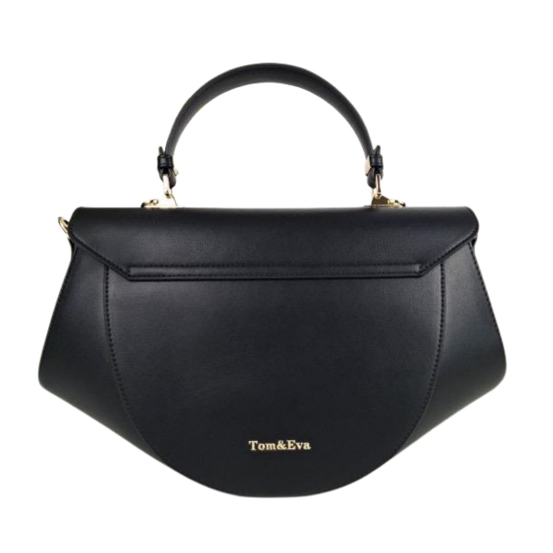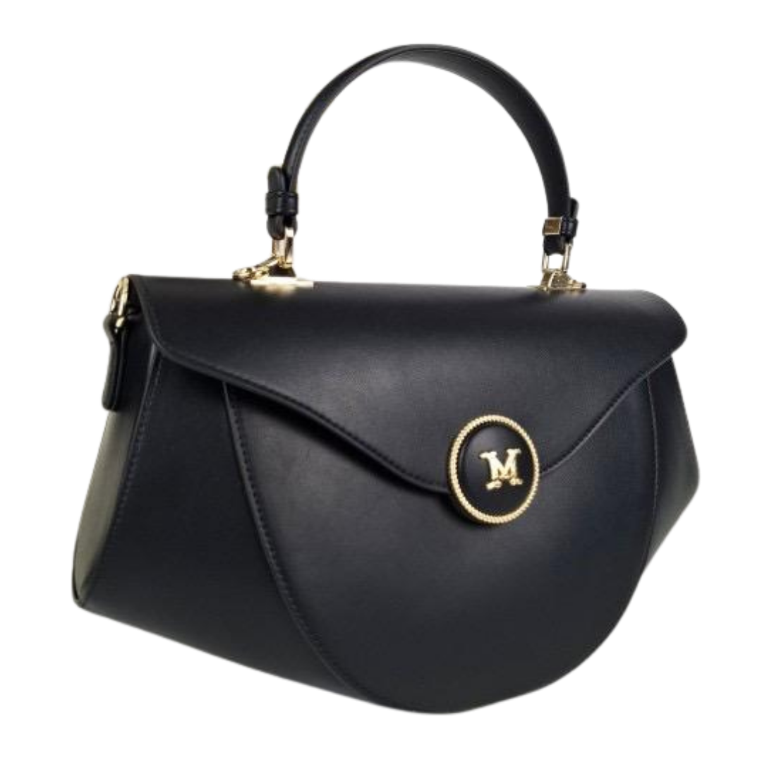 Refined black handbag designed with sculptural lines and gold accents for timeless sophistication.