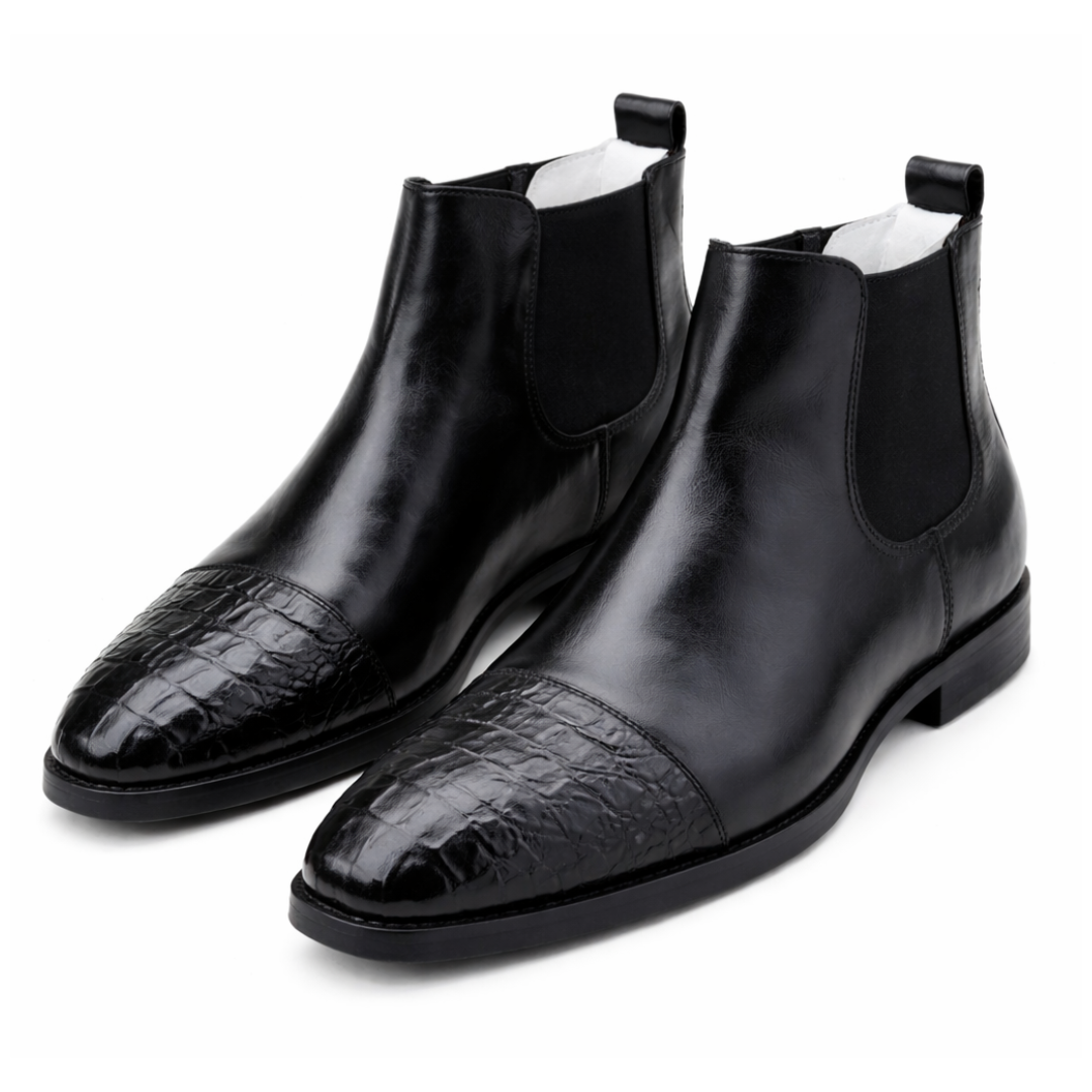 The Obsidian Council is a refined black leather Chelsea ankle boot with a croc-embossed cap toe.