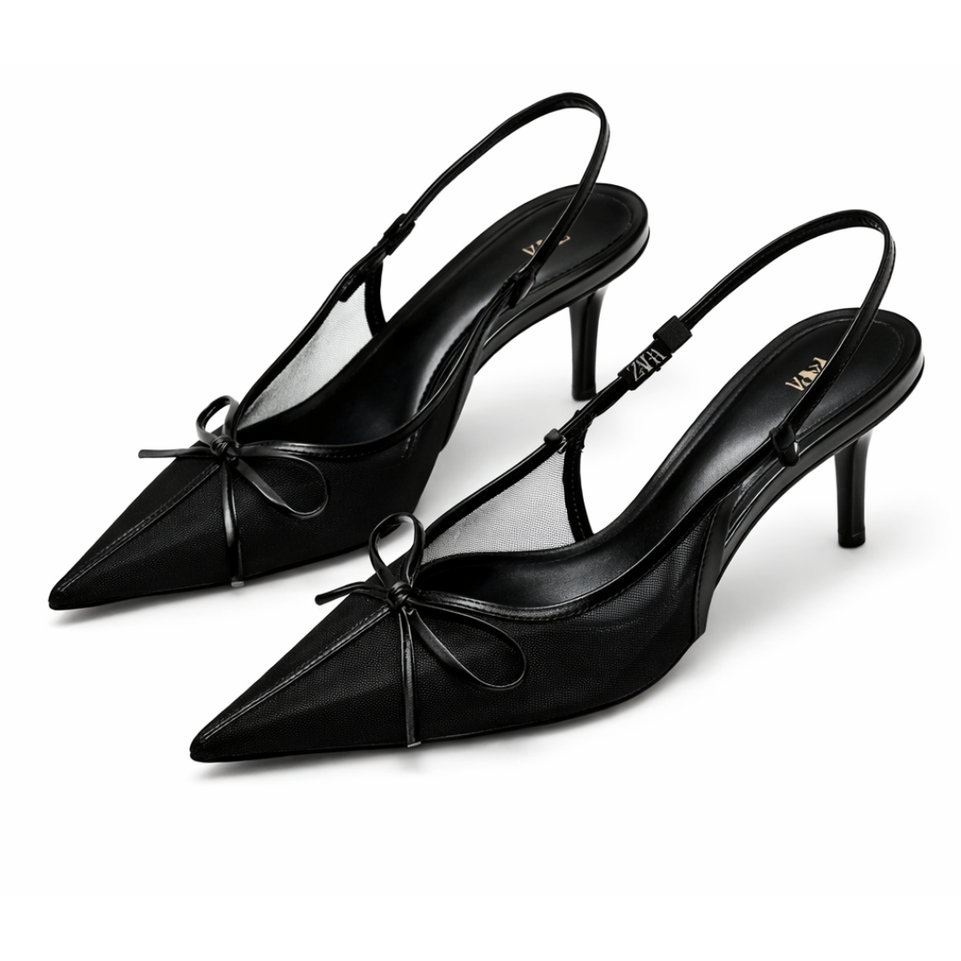 The Regent Stiletto is a refined black mesh slingback heel with a sharp, pointed toe and delicate bow accent.