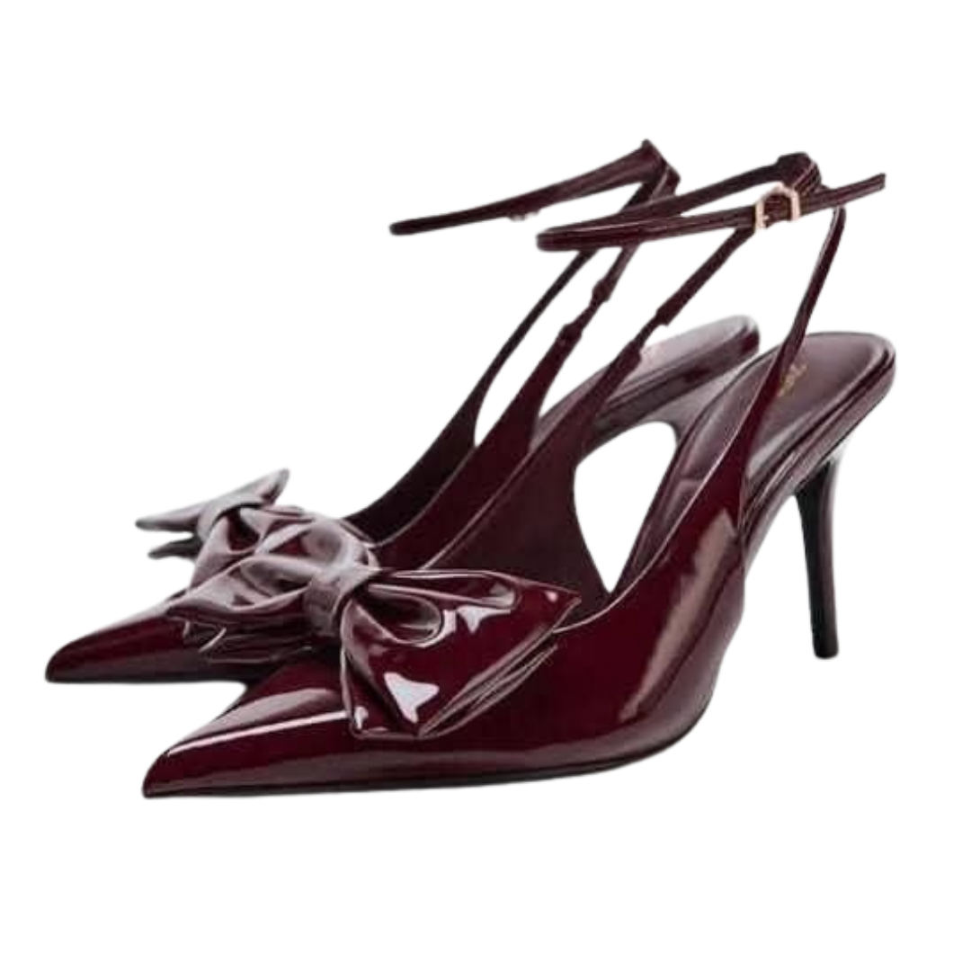 Velouré Bow is a refined slingback stiletto designed with a sculpted pointed toe and statement glossy bow.